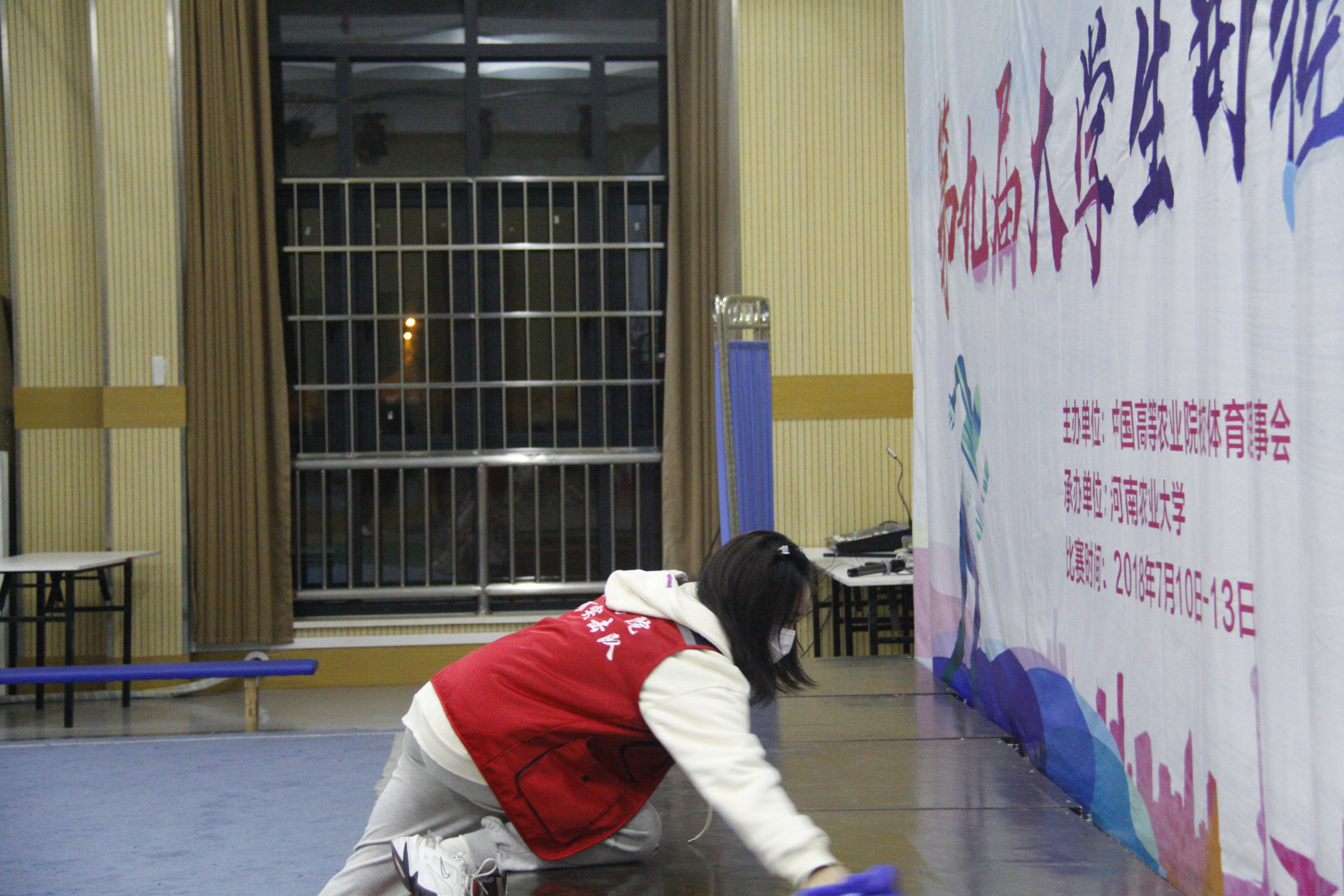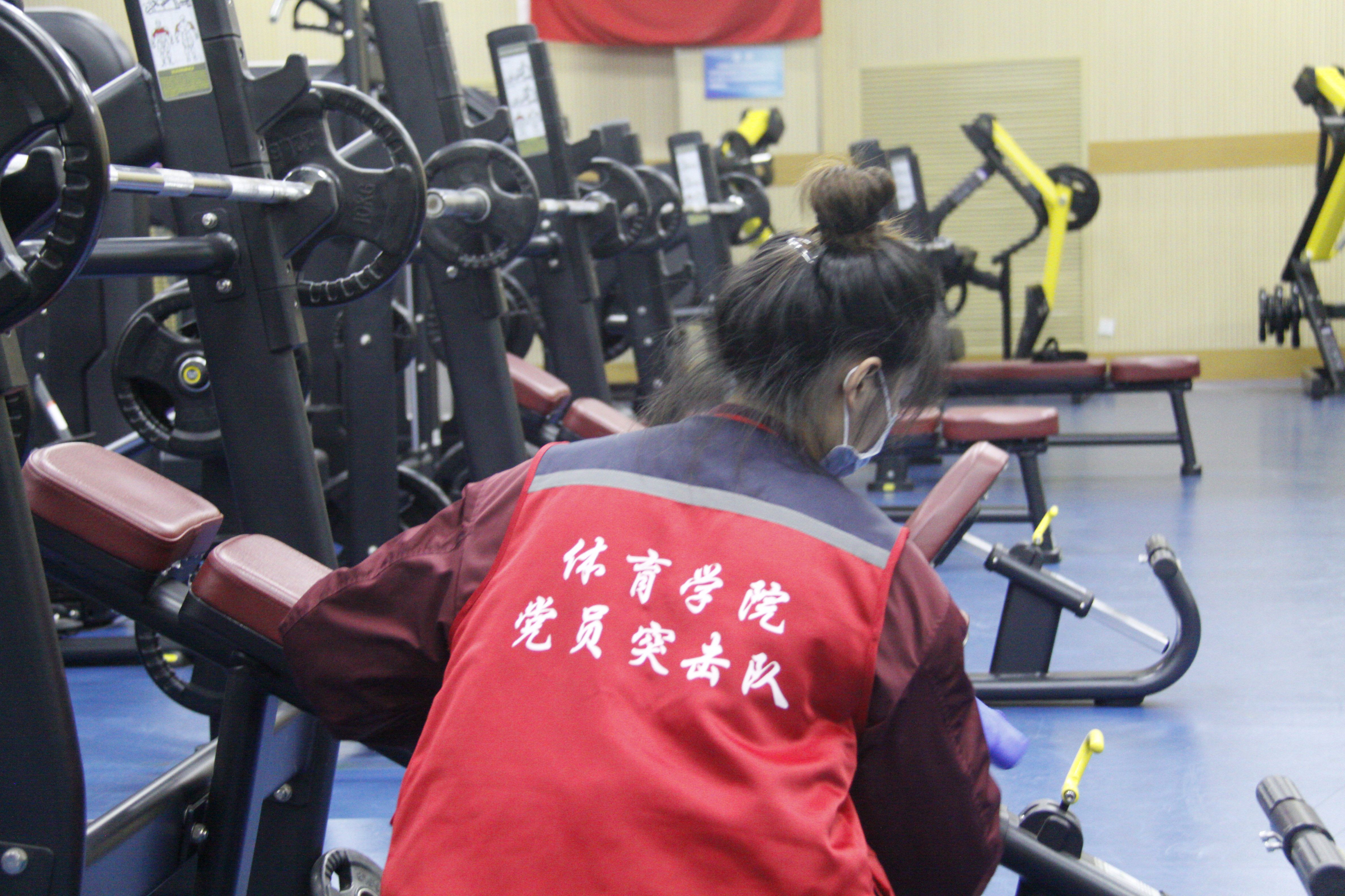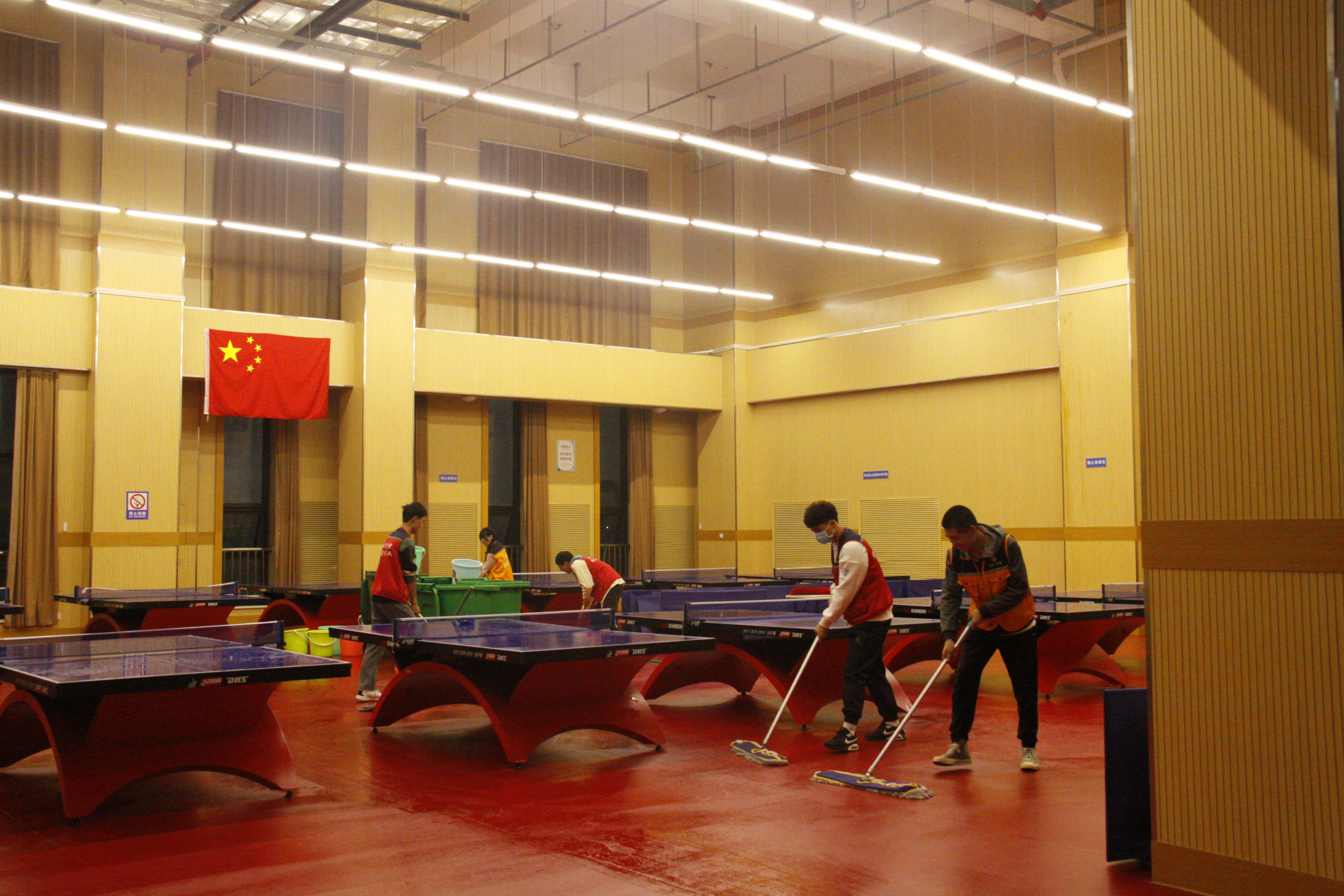 同学们在学生党员的组织带领下,拿着劳动工具早早地就到训练馆外空地集合,手持拖把、抹布、扫帚、垃圾篓等穿梭于训练馆一层、二层全部教室以及楼梯间,扫地、拖地、擦拭,清理垃圾,同学们都很认真的完成自己负责的工作。经过前后历时两天近8个小时的打扫整理,二层7500平米的篮球训练场、羽毛球训练场和排球训练场地焕然一新,一楼的健美操教室、拉丁舞教室…….窗明几净。