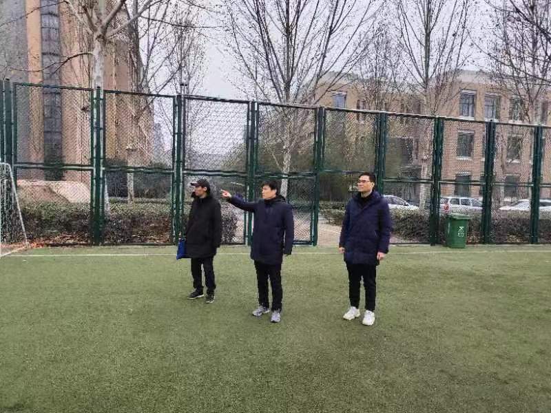 文化路校区视察相关安全工作。在检查完训练馆场地和设备的安全后,对操场、田径场、篮球场上的器材设施、场地条件进行了充分的检查。最后各位领导老师在33号楼乒乓球台前针对文化路校区的检查工作作出总结,指出一些安全问题并给予建议和指导。