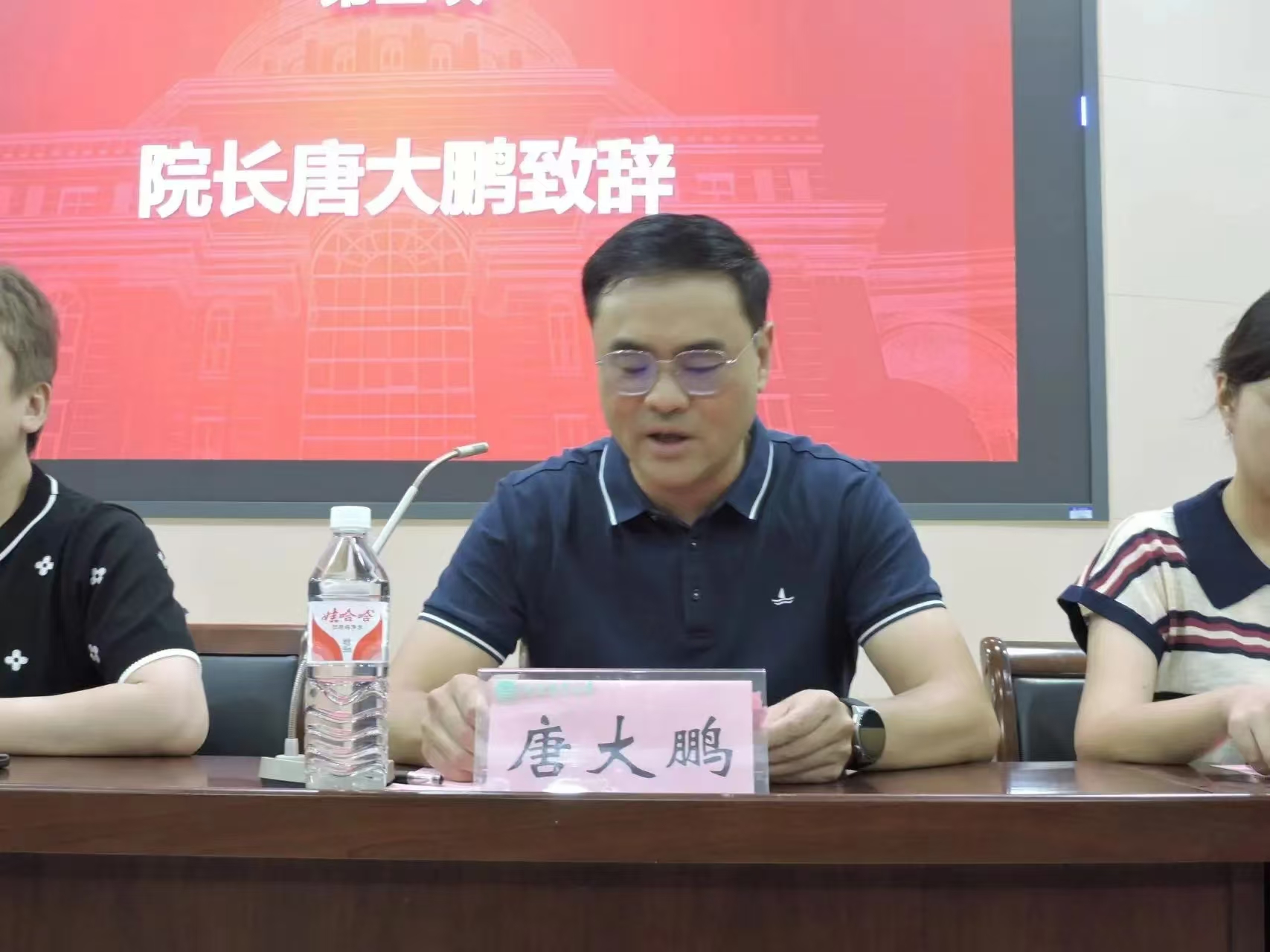 院长唐大鹏致辞,介绍了学院的基本情况、教科研水平、师资队伍以及成绩荣誉等;高年级学生代表2022级舞蹈表演专业1班郑子恒、新生代表2024级社会体育指导与管理专业3班刘梦涵和教师代表体育艺术系党支部书记(主任)王献斐依次发言。