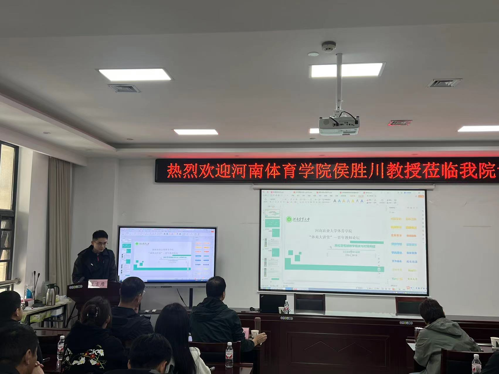 青年教师贾震以“新兴体育项目助力高校体育提质增效的路径研究——匹克球课程构建研究”为题,就选题、研究基础、研究内容、研究价值几个方面展开探讨。栗振华在“河南省高校排球运动发展路径研究”的选题中分享了高校排球运动的现状、发展障碍以及优化路径研究等内容。夏文龙以“高校羽毛球现状与对策构建”为题目分享了其在羽毛球领域的科学研究进展。三位教师认真、细致的分享与讲解,充分体现了香蕉视频