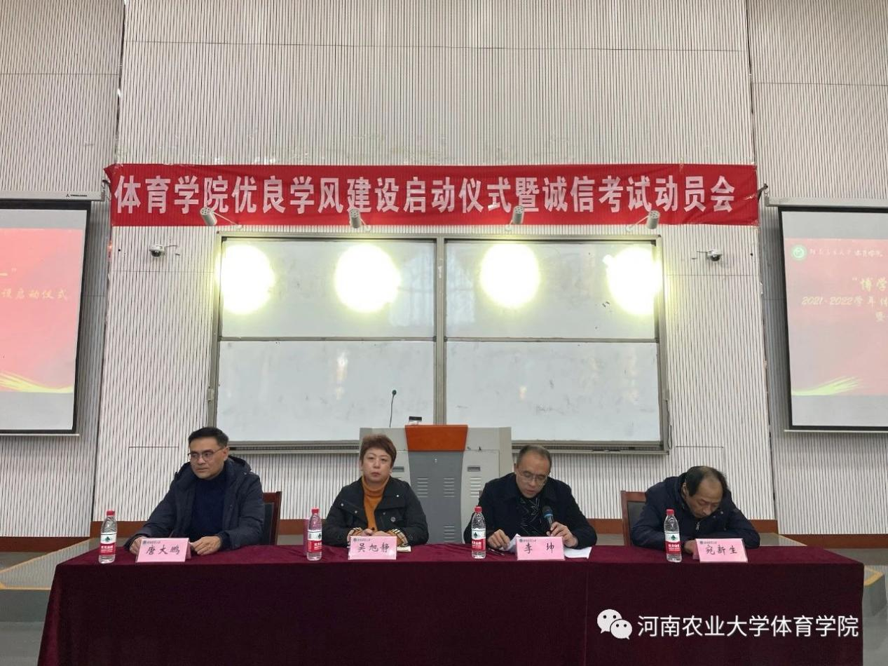 于繁塔楼大教室4举行“博学睿思,知行合一”2021-2022学年优良学风建设启动仪式暨诚信考试动员大会。院党委书记吴旭静、副书记李坤、副院长唐大鹏、副院长宛新生、党政办公室主任王凌娟、团委书记黄妍、辅导员张予倩出席本次活动,四个年级学生代表参与此次活动,会议由副院长唐大鹏主持。