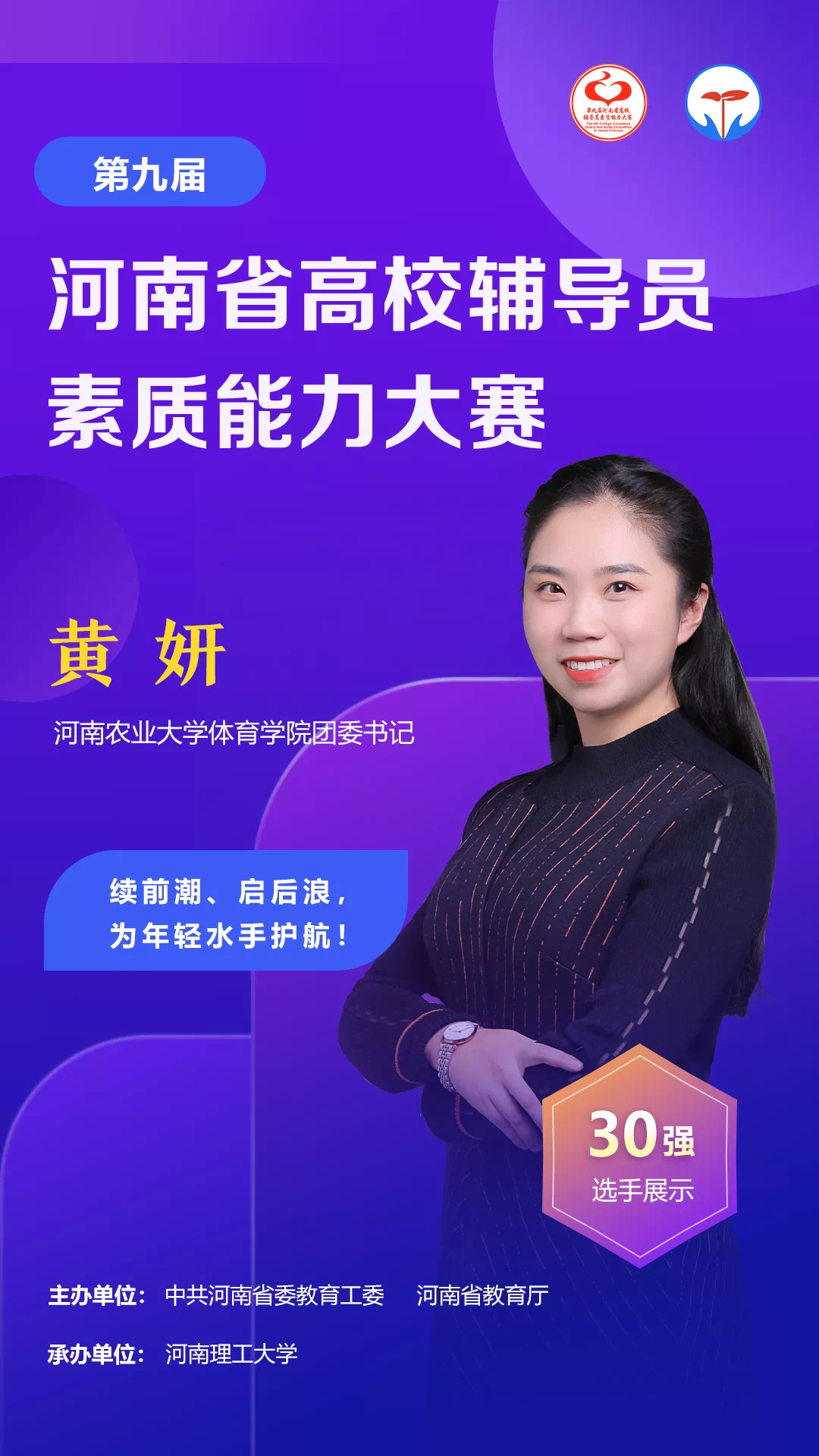 第九届全省高校辅导员素质能力大赛是河南省委教育工委、河南省教育厅为不断提升高校辅导员的理论水平、职业能力和专业素养,推动全省高校思想政治工作高质量发展而开展的一项重要赛事,全省130所高校的133名辅导员参加了本次大赛。比赛项目设置为基础知识测试、案例研讨、谈心谈话三个环节,经复赛比拼,共有30名选手进入决赛,香蕉视频 黄妍老师以扎实的理论储备和出色的临场表现以总分第二顺利晋级决赛,并荣获一等奖。