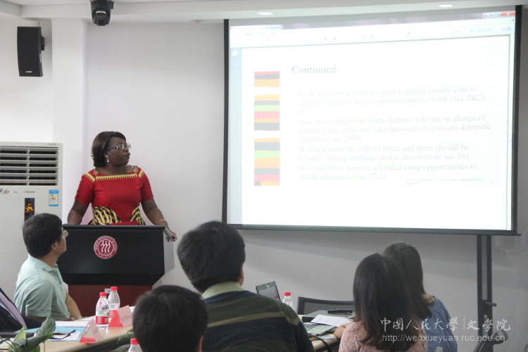 津巴布韦大学法香蕉视频 副院长Slyvia Chirawu主要介绍了津巴布韦的男女平等的实施状况。首先,她指出了性别平等的重要性,她认为实现性别平等可以激发出人们在性别不平等环境下被掩盖的才能,而这一进步会促进津巴布韦的政治、经济、科技和社会的发展。紧接着,她列举了宪法中体现男女平等精神的条款,例如,妇女平等地享有受教育的机会;在委任的政府委员会成员中,妇女数量必须占百分之五十。她表示,经过宪法的不断修订,男女平等在津巴布韦也会得到更好的实施贯彻。