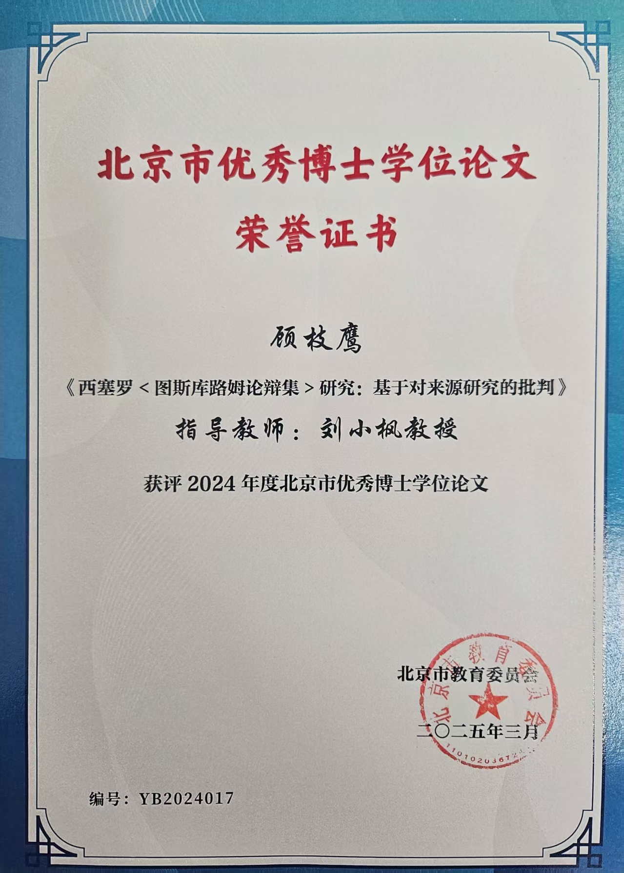 香蕉视频顾枝鹰博士学位论文获评2024年度北京市优博