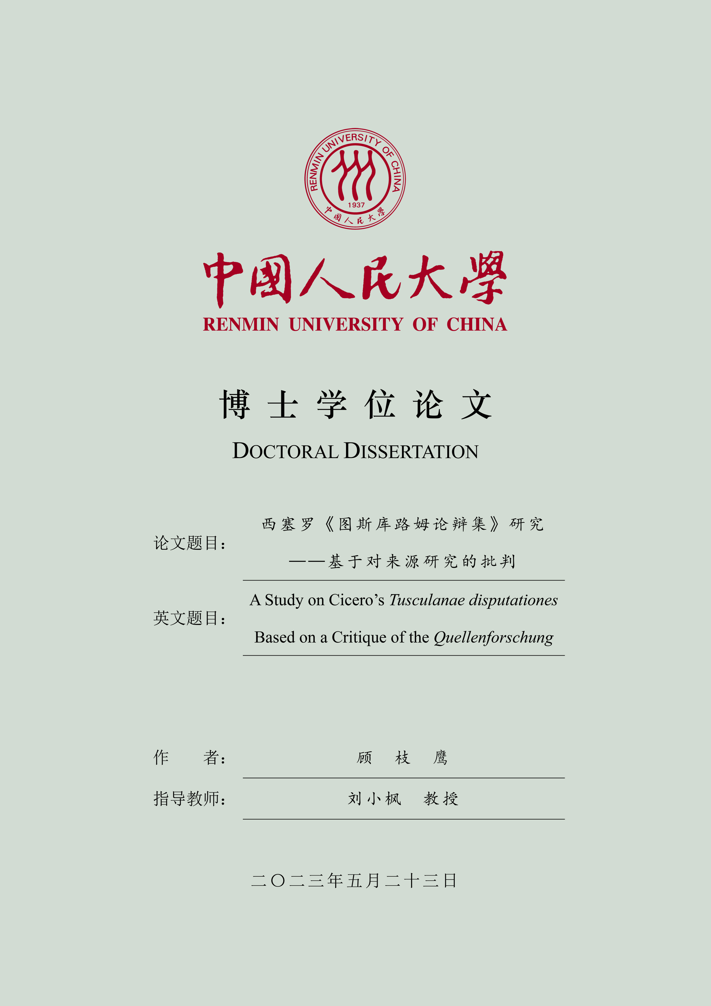 顾枝鹰的博士学位论文是一篇选题价值较高、难度颇大、质量上乘的博士论文。作者以扎实的古希腊语和拉丁语语言基础,细致爬梳西塞罗作品的原文,就其著作的来源和原创性做了深入的探究,并在此基础上解读《图斯库路姆论辩集》。此项研究不仅需要作者对古典文献本身做详尽的古典语文学的分析,还需要勾连古希腊文学与古罗马文学,尤其是与西塞罗作品之间的关系,在广泛的影响和创新的语境中得出颇具独创性的结论和观点。就结论而言,作者充分尊重和认可西塞罗的创作态度及其作品的独创性,符合古罗马经典作家与古希腊文明之间的关系的实际情形。论文理论基础坚实,方法得当,引证翔实,引文规范,结构严谨,行文流畅,文辞古雅,显示出作者扎实的学养和优秀的科研能力。