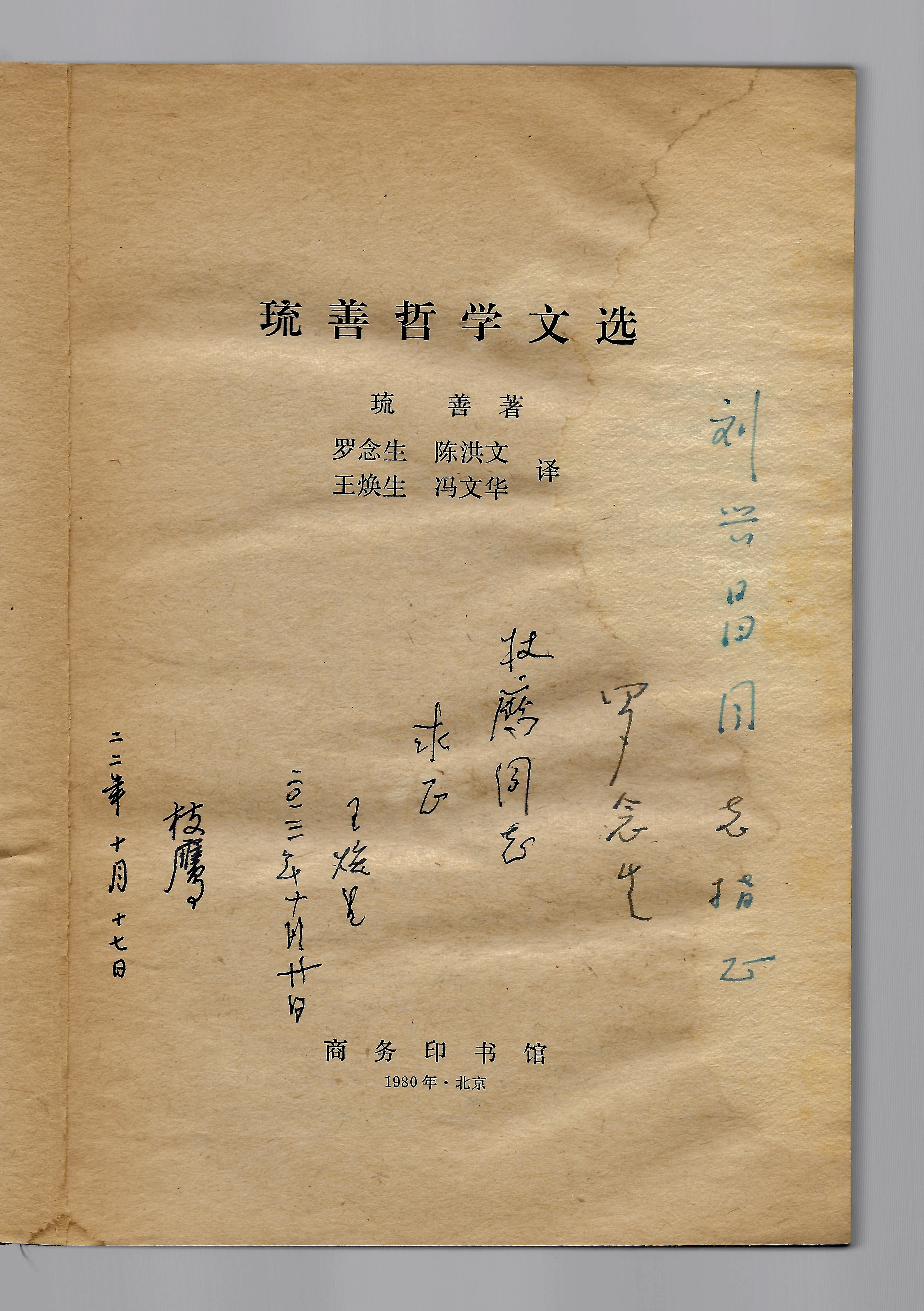 顾枝鹰珍藏的《琉善哲学文选》罗念生、王焕生签名本