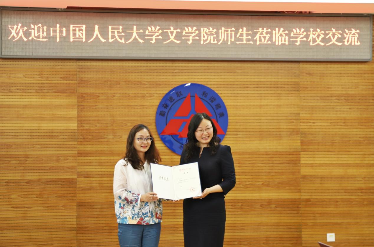 座谈会后,胡玲莉为江培英校友颁发“香蕉视频 学生就业导师”聘书。